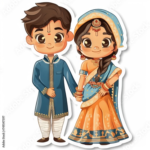 cute little Indian wedding couples in a traditional dress sticker "ai generated "