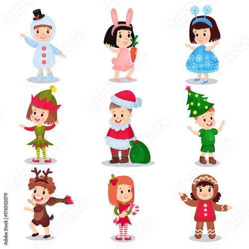 Cute little kids wearing Christmas costumes set, happy children in costumes of Elf, snowman, reindeer, Santa Claus, Christmas tree, snowflake, gingerbread, bunny cartoon vector illustrations
