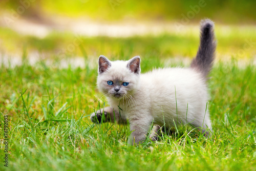 Cute little siamese kitten walking on the grass
