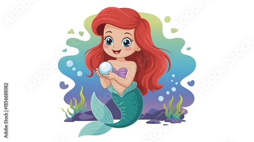 Cute Mermaid with Red Hair Holding Shell on Underwater Background