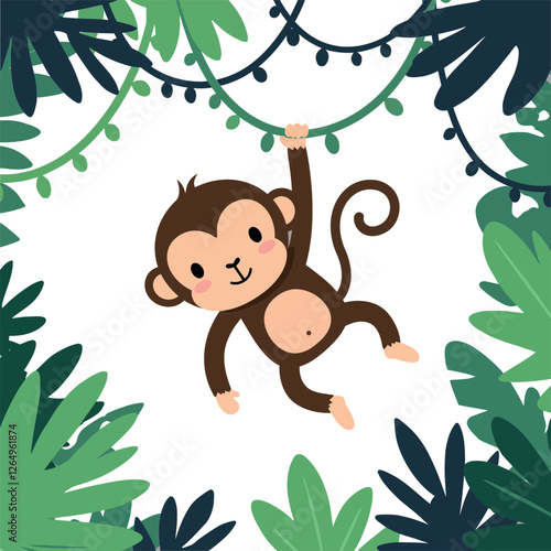 Cute monkey swinging through colorful jungle leaves in flat vector art
