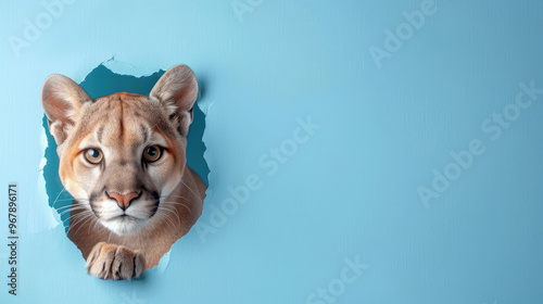 cute mountain lion peeking through a hole in a blue paper wall