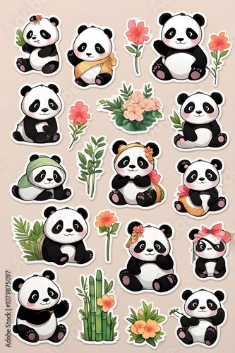 Cute Panda Stickers Collection: Adorable Black and White Bears with Flowers and Bamboo
