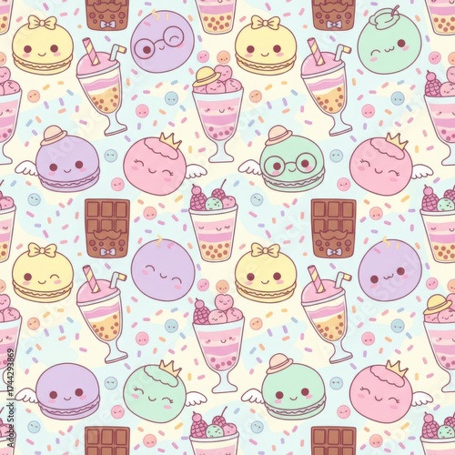 Cute pastel dessert pattern with macarons boba drinks and chocolate