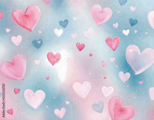 Cute pastel hearts pattern, soft pink and blue background, dreamy romantic atmosphere, watercolor texture, floating heart shapes, Valentine's Day theme, gentle gradient
