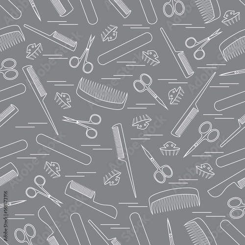 Cute pattern of scissors for manicure and pedicure, combs, nail file, barrettes.