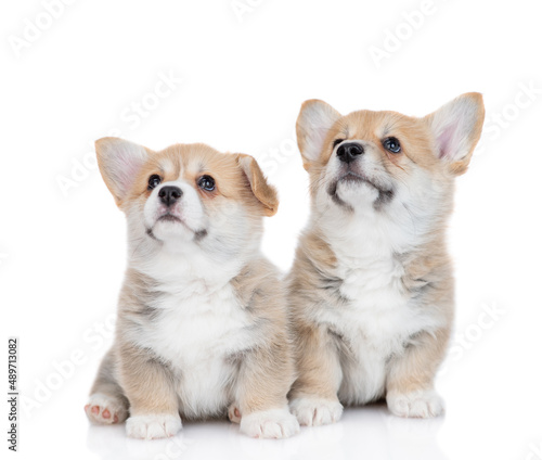 Cute Pembroke Welsh Corgi puppies sit and look up together. isolated on white background