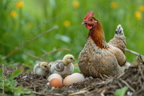 Cute picture of the hen guarding the little chicks. Generative AI
