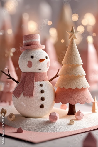 Cute pink snowman with scarf beside pastel Christmas tree in a cozy winter scene setting