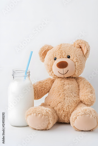 Cute plush toy Teddy Bear sitting near milk, kefir or yogurt bottle isolated on white Backdrop