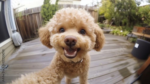 Cute poodle is smiling and looking at the camera