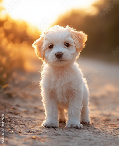 Cute puppy standing happily on a sunlit path with a glowing background for stock photo