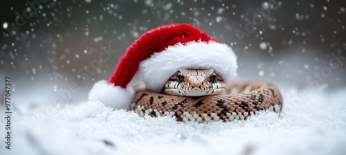 Cute Rat Snake in a Santa Hat on Snow with Falling Snow, Festive Winter Wonderland Scene
