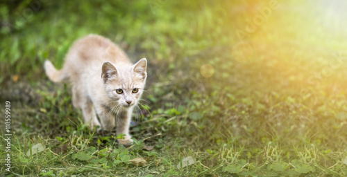 Cute red kitten walking in the grass