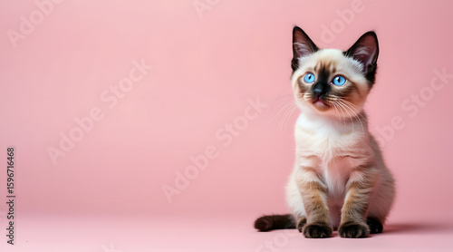 Cute Siamese kitten with bright blue eyes sitting on soft pastel pink background, looking curious and attentive