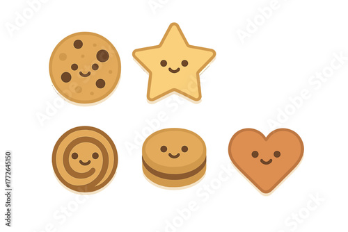 Cute smiling cartoon cookies set in various shapes like star, heart, and chocolate chip