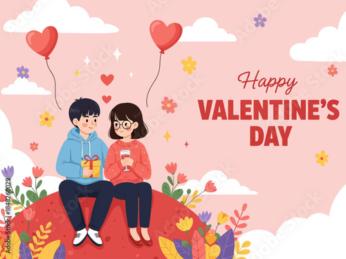 Cute Valentine’s Day illustration of a happy couple sitting together with gift and drink, surrounded by hearts, flowers, and clouds. Romantic flat design ideal for cards, banners, and love celebration