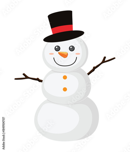 Cute Vector Snowman Illustration with Black Top Hat and Carrot Nose Isolated on White Background
