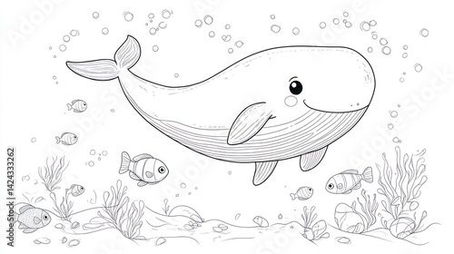 Cute whale in underwater scene, coloring book illustration