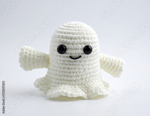 Cute White Crochet Ghost with Black Eyes and Smile on Neutral Background