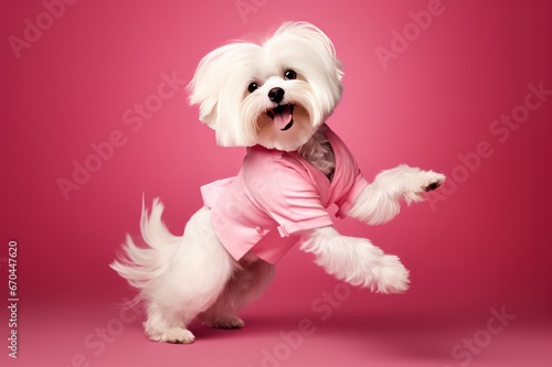 cute white maltese dog dancing in pastel t-shirt on pink background studio horizontal portrait