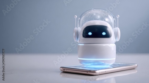 Cute White Robot with Blue Eyes Sitting on a Smartphone artificial intelligence technology