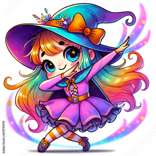 Cute witch with vibrant hair and rainbow background performing the dab dance move, playful expression. Watercolor Clipart isolated on Transparent Background.