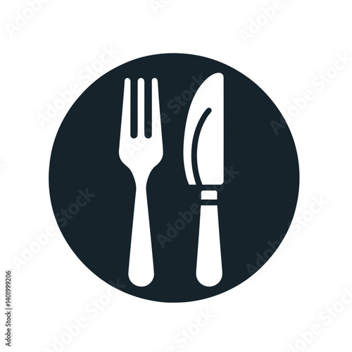 Cutlery icon with fork and knife on round black background