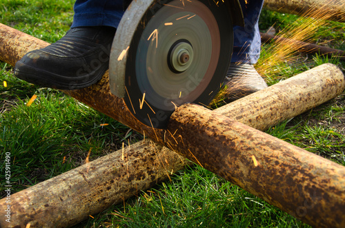 Cutting a metal pipe in the yard,