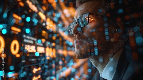 Cyber lawyer analyzing digital case files upper body in frame glowing data screens behind