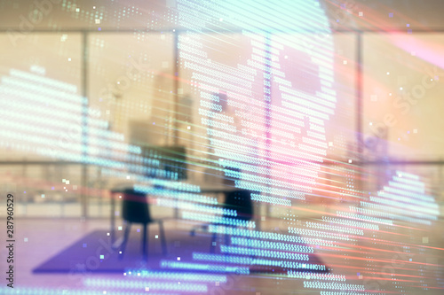 Cyber piracy hologram with minimalistic cabinet interior background. Double exposure. Hacking concept.