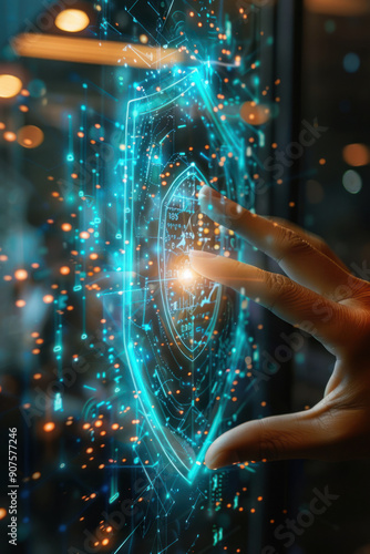 cyber security, A close-up of a human hand actively interacting with a floating tech-security holographic icon that features a shield design. The setting is a modern office space,