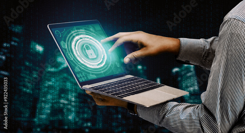 Cyber Security and Digital Data Protection Concept. Icon interface showing secure firewall technology for online data access defense against hacker, virus and insecure information for privacy. uds