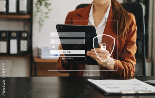Cyber security concept, Login, User, identification information security and encryption, secure access to user's personal information woman using smart phone and tablet .