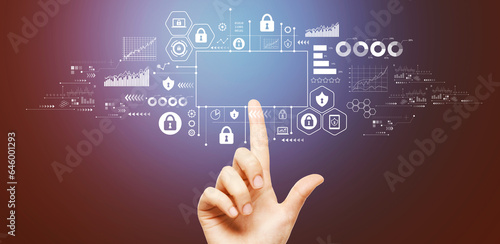 Cyber security theme with hand pressing a button on a technology screen
