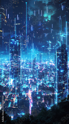 Cyberpunk Cityscape: Futuristic city skyline at night, illuminated by neon lights and digital rain. High-rise buildings reach towards a dark, cloudy sky, creating a dramatic and vibrant scene.