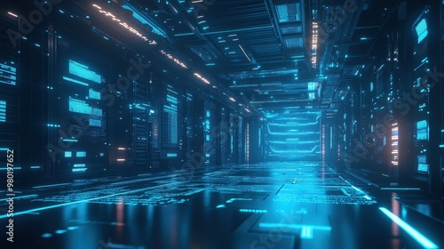 Cyberpunk Corridor with Glowing Blue Lines