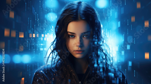 Cyberpunk woman portrait in futuristic cityscape