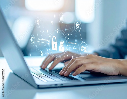 Cybersecurity and Data Protection with Laptop and Lock Icons on Gradient Background