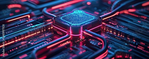 Cybersecurity and technology in network security concept. Futuristic circuit board design with vibrant neon lights.