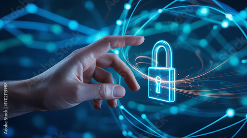 Cybersecurity Innovation A Hand Touching a Glowing Lock Symbol in a Network of Data Nodes and Connections Representing Secure Data Transfer