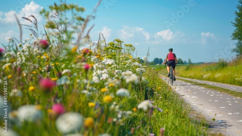 Cyclist Enjoying a Spring Countryside Path with Blooming Flowers Under a Clear Sky - Ideal for Posters