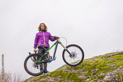 Cyclist holding a mountain bike on top of the free space.