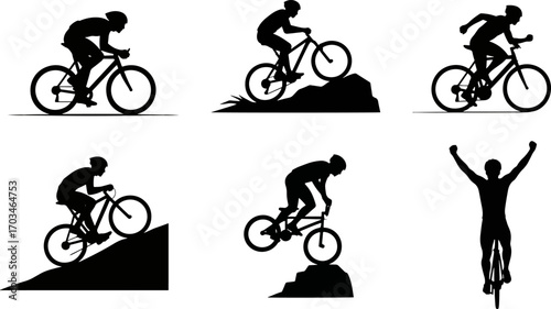 Cyclist Silhouette Collection Showcasing Various Mountain Biking Activities, Including Uphill Climbs, Jumps, and Celebratory Finishes, on a White Background