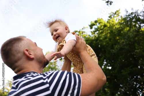 Dad having fun with his newborn baby outdoors. Happy Father's Day