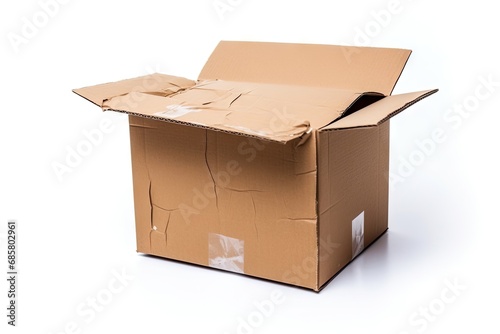 Damaged Box Isolated, Craft Paper Delivery Package, Broken Carton Packaging, Crumpled Cardboard Box