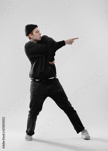 Dancer dressed in black jeans, sweatshirt, hat and gray sneakers is dancing making movements with his hands in the studio on the white background