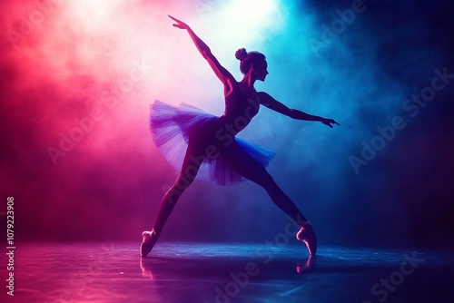 Dancer performing on stage in a spotlight. Poised and elegant in mid-movement.