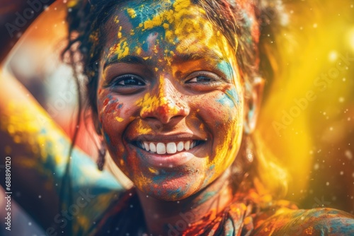 Dancing Colors of Holi: Witness the Cultural Extravaganza as a Joyful Indian Woman, with a Colored Face, Engages in Traditional Dance Amidst the Festive Celebrations.