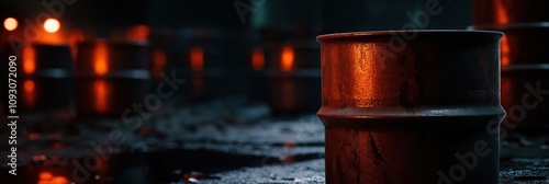 Dark and moody imagery of rusted barrel drums sets a mysterious industrial scene, hinting at untold stories and the remnants of forgotten places in a shadowy world.